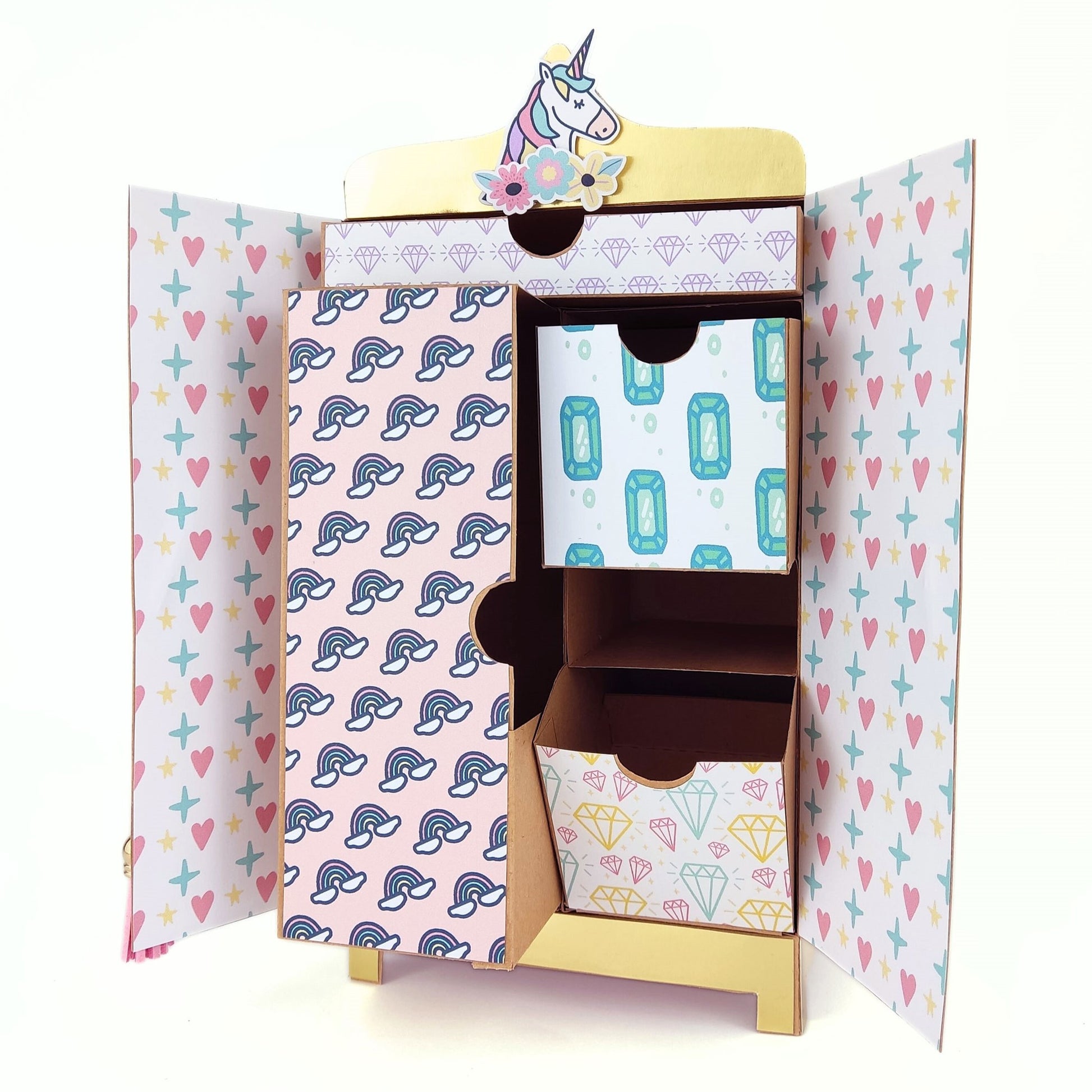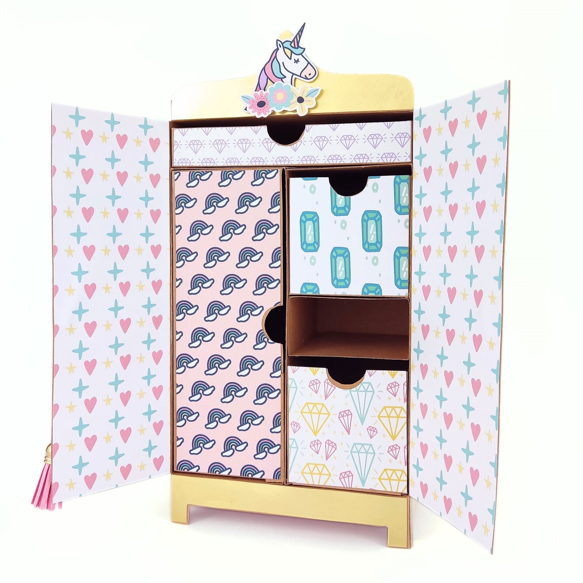 Con el Kit Armario "mis secretos", l@s pequeñ@s artistas podrán montar y decorar un armario con varios cajones, decorarlo con los papeles y accesorios, y personalizarlo a su gusto.